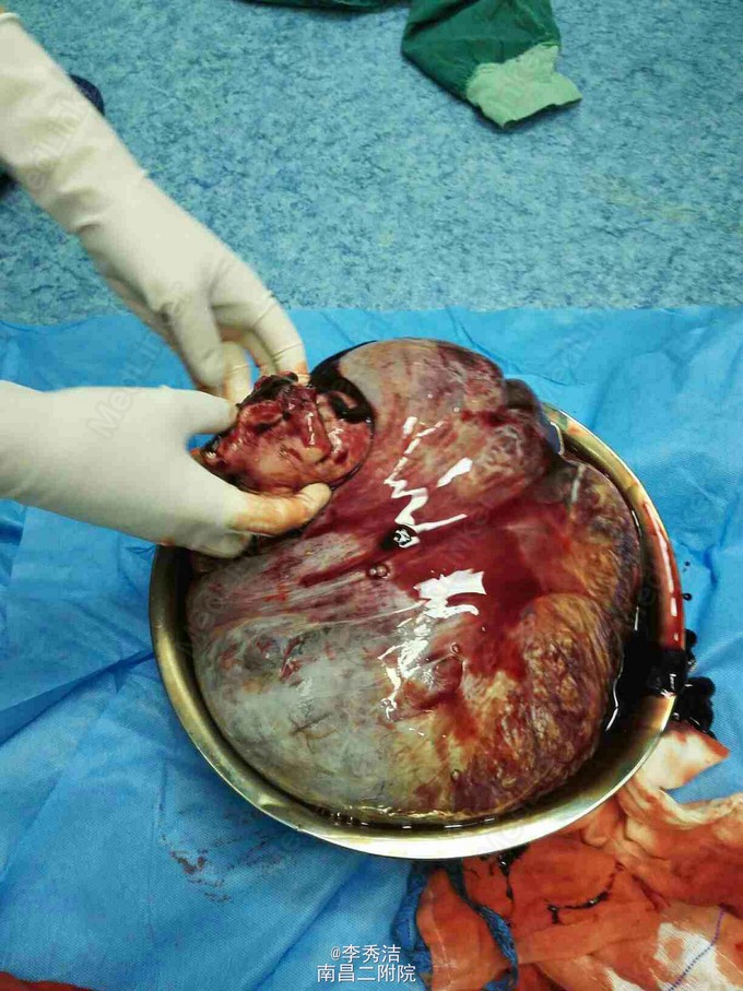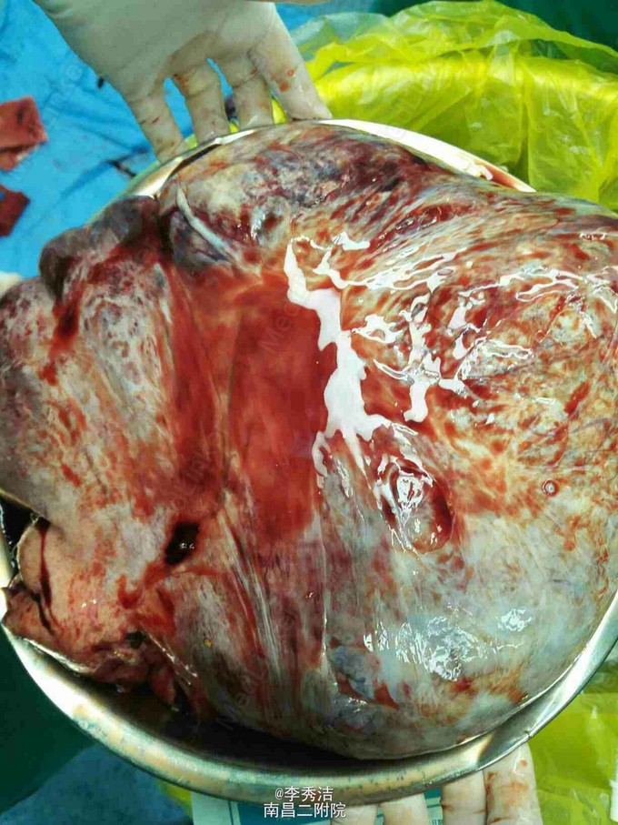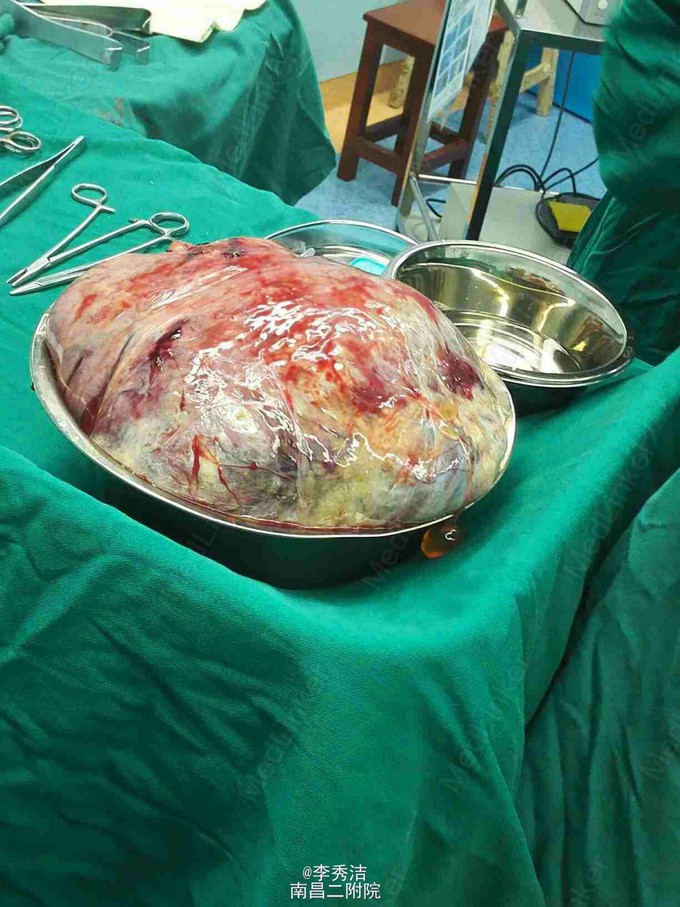 行剖腹探查术,术中见子宫血管显露,子宫底部触及一大小约35*30*12cm肌瘤样囊性包块,占据盆腹腔大部分,质软,表面光滑,充满手术野,包块与盆腔后壁肠系膜膜性粘连,右侧卵巢见一直径约5cm囊性包块,表面光滑。松解粘连后,行子宫肌瘤剔除术+右侧卵巢囊肿剔除术,剔除肌瘤16Kg。术中冰冻切片示:(子宫)初步考虑平滑肌瘤伴出血、变性。右侧卵巢良性囊性病变。诊断为1.子宫肌瘤变性,2.右侧卵巢囊肿。