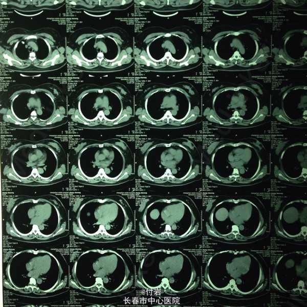 女患,56岁,发现左乳肿物1年而入院。该患1年前自觉左侧乳房疼痛,未在意,未行特殊检查及治疗,1天前疼痛加重而来诊。门诊行胸部CT示左乳肿物。既往高血压病史4年。