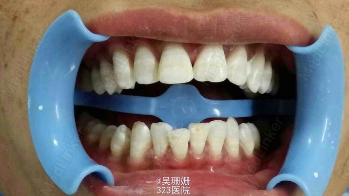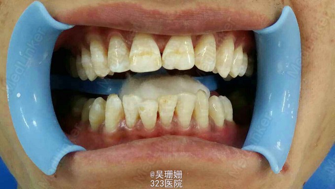 前牙氟斑牙中度,上下前牙清洁,抛光,隔湿,行冷光美白术!