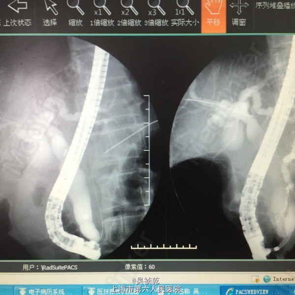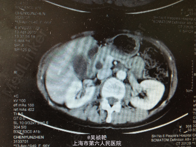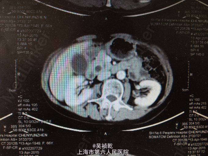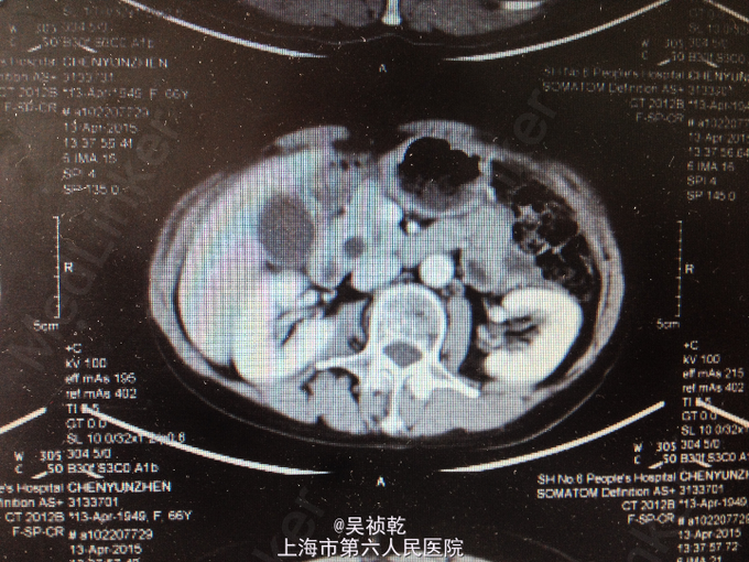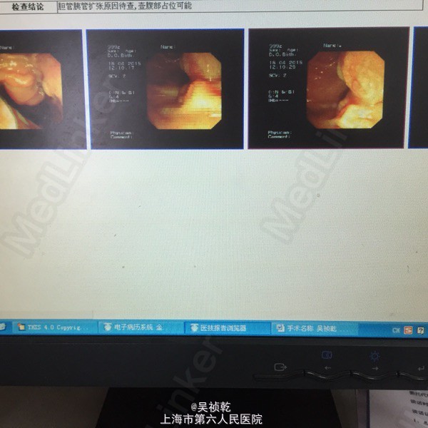 患者女,65岁。因“反复右上腹饱胀不适5年,无黄疸纳差”入院。患者5年前无明显诱因下出现右上腹疼痛不适,不能自行缓解,当地医院就诊予对症治疗后好转,行保守治疗,近几年发作频率明显增高,故来我院门诊就诊,B超(2015年4月01日):胆囊内部高回声堆积,考虑泥沙样结石,胆囊偏大胆总管、肝内胆管及主胰管扩张。胆囊大小:125*31mm,CBD直径:1.2cm,胆囊壁厚度:0.3cm。现为进一步诊治,拟“胆囊结石伴慢性胆囊炎,胆总管扩张”收入院。