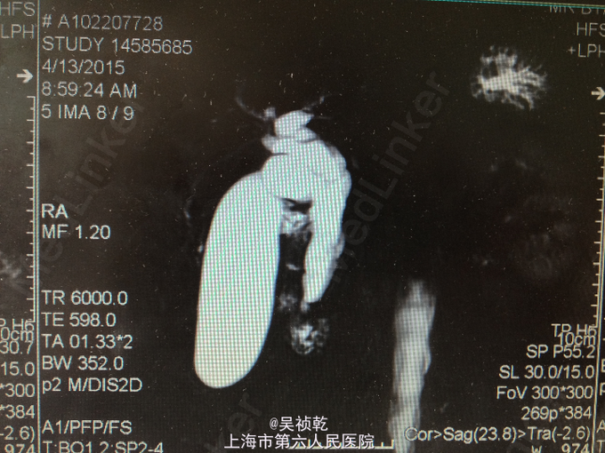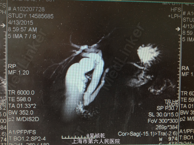 查体:皮肤巩膜无明显黄染,腹部平坦,未见明显胃肠型及异常隆起,全腹软,右上腹部压痛不明显,无反跳痛,无肌卫,无腹部反跳痛,全腹无包块,肝脏肋下未触及,脾脏肋下未触及,无肝区叩击痛,Murphy’s征阴性,肠鸣音正常,移动性浊音-。 辅查:血常规(2015-4-1):WBC:5.9×109/L,N:57.6%,RBC:4.17×1012/L,Hb:127g/L,PLT:196×109/L。肝功能:ALT:109U/L,AST:87U/L,TB:18.6umol/L。肿瘤标记物:AFP:2.7ug/L,CEA:4.71ug/L,CA19-9:37.19KU/L。 2015-4-13 上腹部MRI报告:1.胆总管下段异常信号,胆总管、胰管轻度扩张,胆总管下段结石可能大,必要时MRI增强检查,排除胆总管下段占位。2.胆囊颈结石,胆囊增大。3.附见;肝脏左叶囊性病灶。 2015-4-14上腹部增强CT报告:1.胆总管下端异常强化,结石可能,肝内外胆管及主胰管扩张,胆囊增大,必要时MRI增强进一步检查。2.肝脏小囊肿。