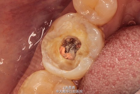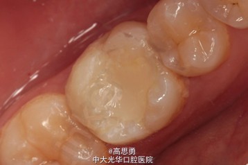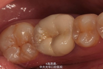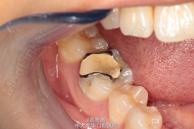 #46颊he面见嵌体修复,嵌体底层为金属,表层为黄色瓷类似物,边缘密合;嵌体中央见开髓洞形,牙色暂封物;叩(-),松(-)。