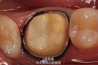 去除#46充填物及拆除嵌体后,视牙体剩余情况选择治疗方案。因牙齿颈部剩余牙体组织较多,四壁都有牙体组织剩余,最终选择的方案为:树脂桩+半贵金属烤瓷全冠修复。