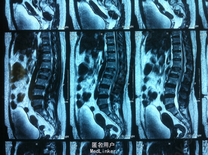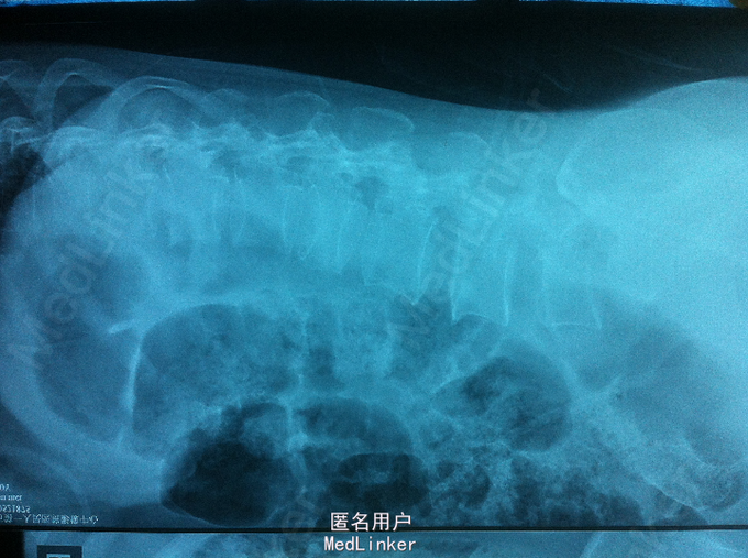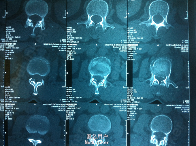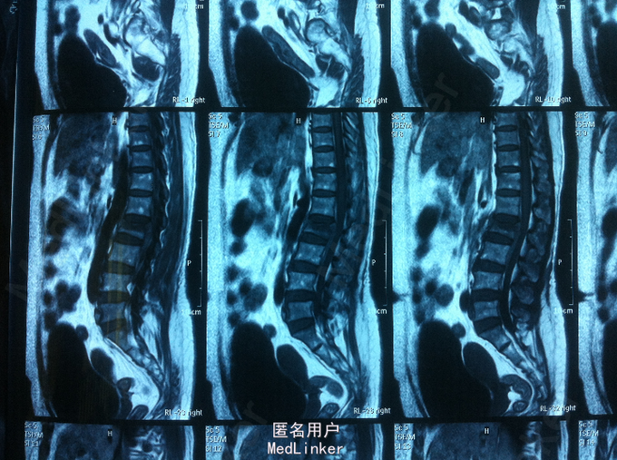 PE:腰部轻度后凸,叩痛,双下肢感觉无减退,双下肢肌力4-5级,巴氏征 阴性。 X-ray:腰2椎体骨折 CT:腰2椎体骨折,椎体后缘不连续 MR:腰2椎体骨折,腰2-3椎体水平硬膜外血肿