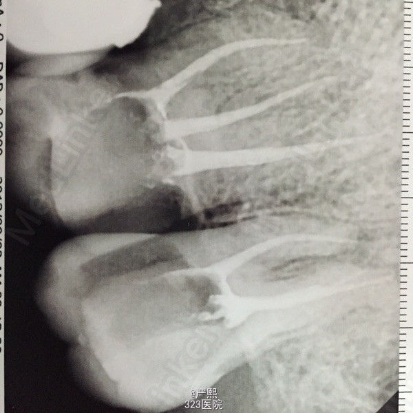 诊断:26,27牙髓炎 26,27髓石。 处理:26,27局麻下开髓,低速手机去除髓石,建立根管直线通路。Protaper扩至F1,测长:26,P:19mm,MB:18mm,DB:18.5mm。 27,P:18mm,MB:17mm,DB:17.5mm。双氧水生理盐水交替冲洗,试胶,干燥根管,封木棉。一周后复诊根管充填。