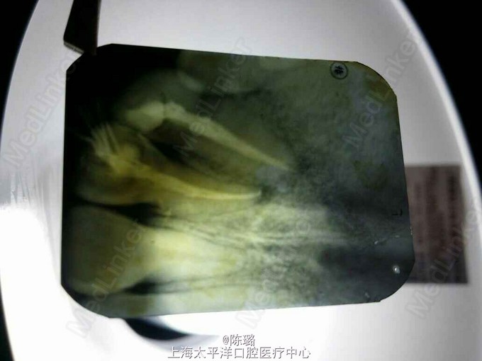 患者女20岁,主诉外伤后左前牙变色数月来院就诊,给予根管治疗,根尖长度22.5mm,放药FC,一周后换药,二周后根充,X-ray 见根尖处有0.2*0.2mm阴影!予以树脂充填。门诊随访,待炎症吸收阴影消失,冠修复。