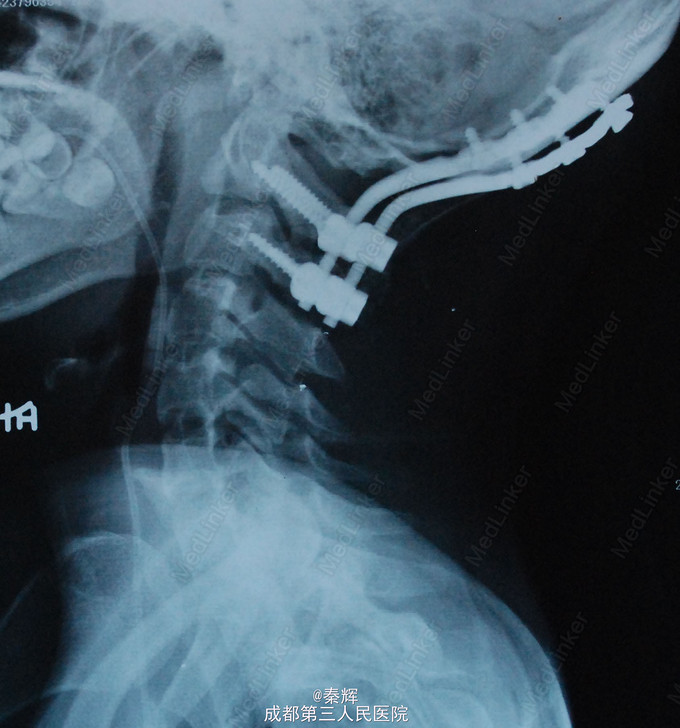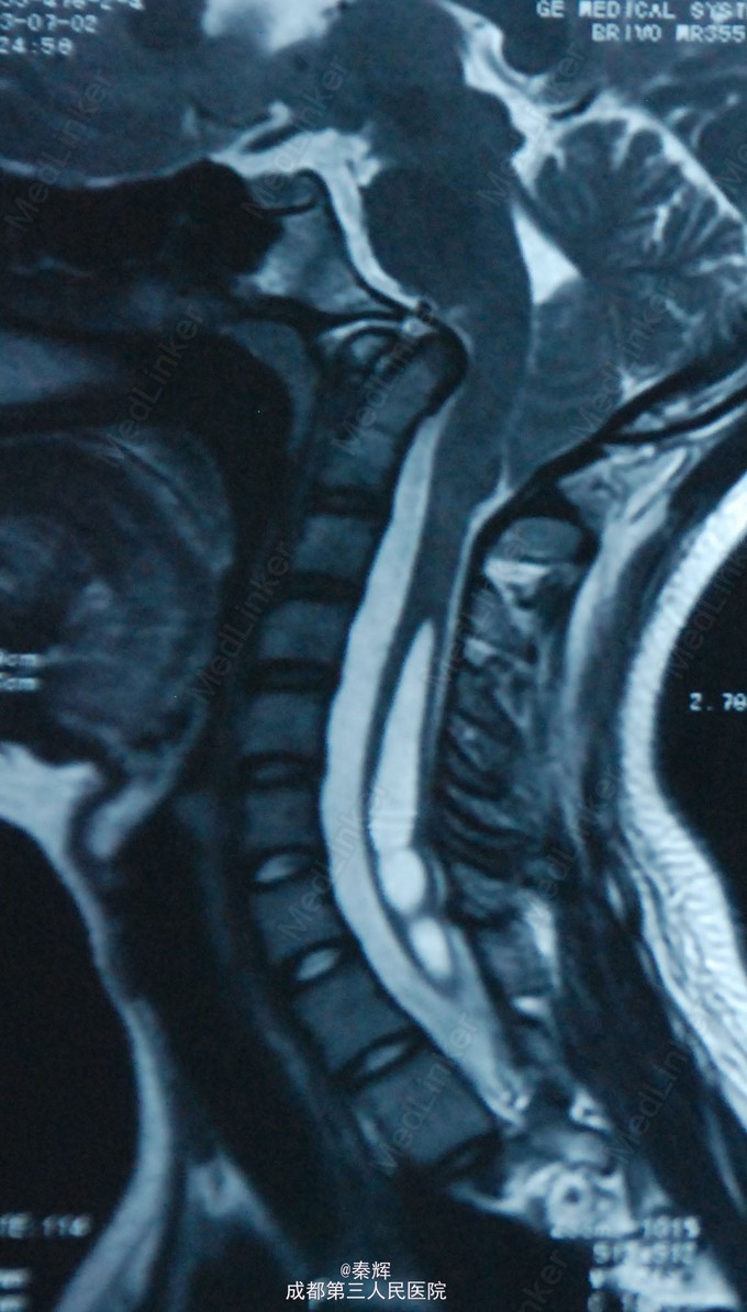 诊断“颅底凹陷、脊髓空洞”,行牵引复位、枕骨大孔扩大、枕颈融合、内固定术。