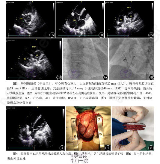 术后第7 天出院,患者恢复良好。出院前复查超声心动图示心房水平未见残余分流,无二尖瓣及三尖 瓣反流,无心包积液。术后一个月门诊复查,心电图示:窦性心律,不完全性右束支传导阻滞。 超声心动图检查示:心房水平未见残余分流,右心房右心室不大,无二尖瓣及三尖瓣反流,无心包积液;肺动脉收缩压为22 mm Hg。封堵器脱落的处理:一旦确定封堵器脱落,力求早发现早处理,可通过介入方法 或外科手术 取出并同期干预缺损。虽然有介入法取出封堵器的报道,但对于房间隔缺损封堵器大,封堵器脱落位置特殊或可能有腱索缠绕等介入方法取出困难者,勉强进行介入方法取出容易造成继发性损害,建议外科手术取出并同期干预缺损为宜。