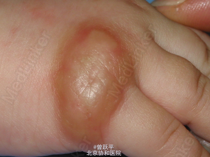 患儿女,5个半月。 因右手背皮肤结节、水疱、血疱,伴全身反复出现红斑、风团5个半月来我院就诊。 患儿出生时,右手小指掌指关节伸侧有一绿豆大丘疹,摩擦后肿大,表面起水疱、大疱或血疱,皮损渐增大。 患儿常出现全身阵发性红斑、风团和面色苍白,持续约数小时至数天后缓慢消退。 个人史:患儿系第一胎第一产,足月顺产。 家族中无类似患者。