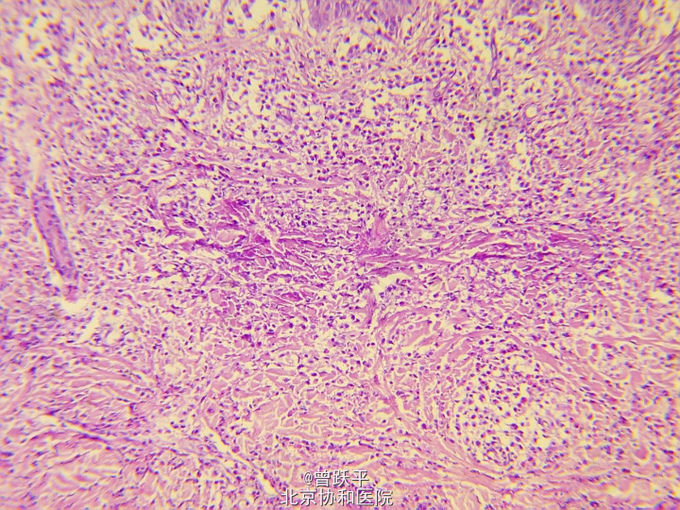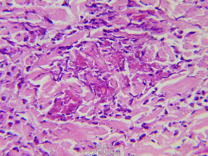 查体:一般情况良好。系统检查无异常。全身浅表淋巴结未触及。 右手小指掌指关节伸侧可见一1.4cm×2.5cm棕红色结节,界清,橡皮样硬度。 躯干、四肢散在分布许多大小和形态不一的红斑和风团