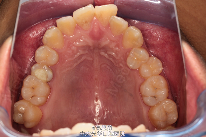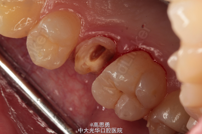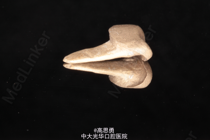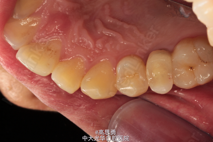 左上5远合面牙色暂封物,探(-),扣(-),松(-)。X线示根充可。