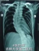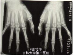 查体:患者明显外形异常。四肢细长,蜘蛛指,双臂平伸指距大于身长,双手下垂过膝,下半身比上半身长。长头畸形、面窄、高腭弓、耳大且低位。皮下脂肪少,肌肉不发达,肌张力低,呈无力型体质。脊柱侧凸。 辅查: 胸片如图一,示脊柱侧突 手部X片如图二,示蜘蛛指 手部外形如图三 右眼视力为 0.25,左眼为 0.05,双眼眼压正常;瞳孔散大后裂隙灯检查发现双眼晶状体脱位入玻璃体腔,眼底检查发现存在视网膜变性,但是未见视网膜撕裂及视网膜脱离的任何迹象。