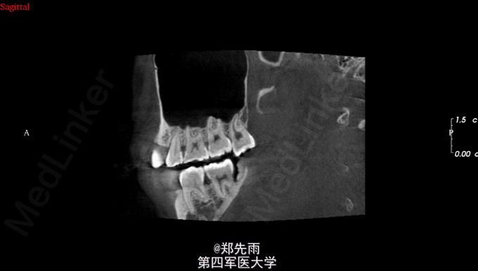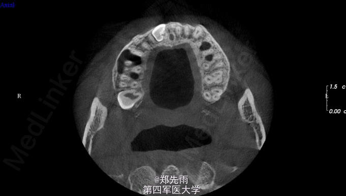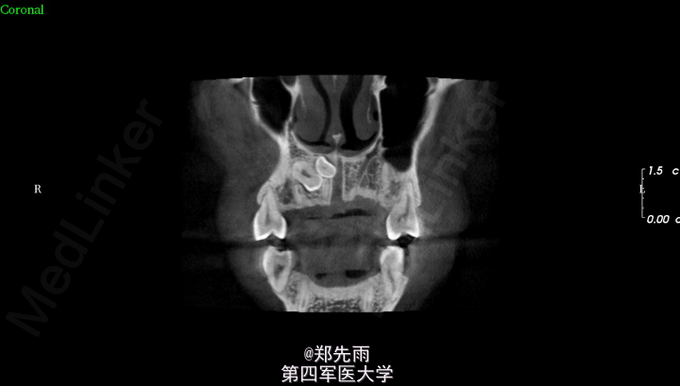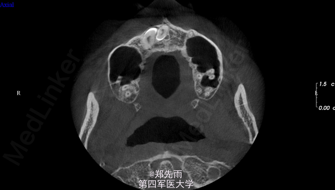 13先天性埋伏阻生,前鼻棘下方埋伏牙,行CBCT检查提示均位于唇侧,但CBCT提示双侧上颌后牙牙根不同程度位于上颌窦内。