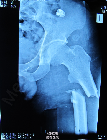 左股骨粗隆下骨折, 使用锁定钢板固定.