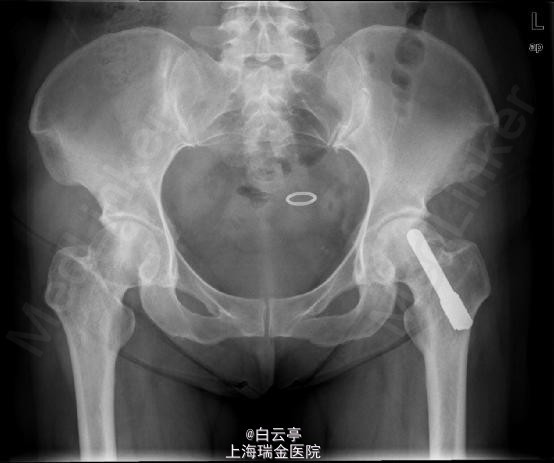 诊断:双侧股骨头坏死。 治疗:左侧:钻孔减压+对侧髂骨移植+钽棒植入。右侧: 钻孔减压