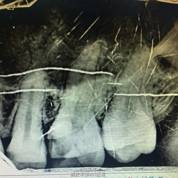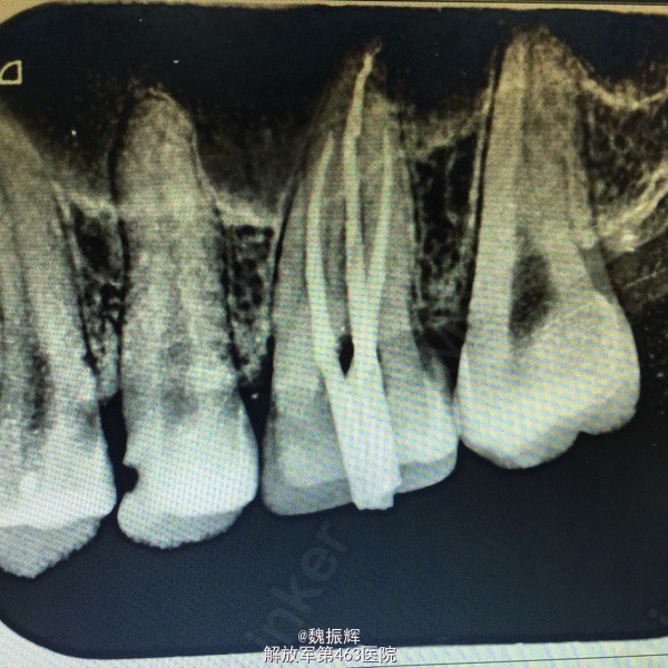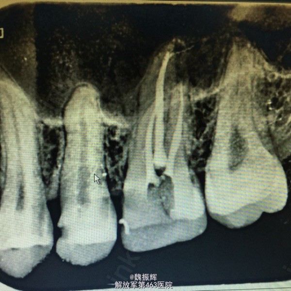 26的近中龋坏,探(+),冷(+),叩(-),X线示龋坏近髓达髓角。