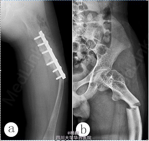 患者,男,7岁时因跌倒致左股骨中上段骨折于2004-06-26入院,行复位钢板内固定,4个月后骨折端愈合。13岁时因左大腿和右小腿逐渐出现弓形畸形、肢短、跛行3年于2011-09-07入院