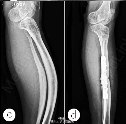 术后大、小腿切口愈合,左下肢给予石膏托外固定1个月,术后1周静脉滴注唑来膦酸5mg,4个月后股骨和胫骨截骨端愈合。2年后手术取出股骨和胫骨内固定物,术中见股骨较之前增粗,骨皮质较硬且牢固;X线片示左股骨中上段截骨和右胫骨截骨端愈合良好,骨皮质较之前增厚;再次静脉滴注唑来膦酸5mg。于2014-06-14行左胫、腓骨中段截骨矫形钢板内固定术,术中见骨质较牢固、骨皮质较厚;X线片示左股骨和胫骨骨质良好,骨皮质较之前增厚(图1d);第3次静脉滴注唑来膦酸5mg,患者双下肢基本等长。 参考文献:中国骨与关节损伤杂志2015 年4 月第30 卷第4 期Chin J Bone Joint Injury, Apr. 2015, Vol. 30, NO. 4
