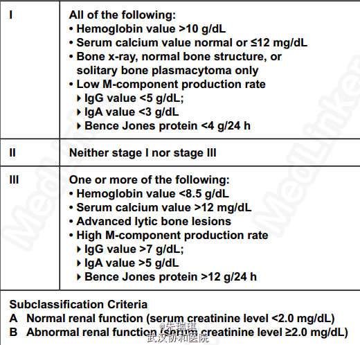 本例特点:本例多发性骨髓瘤LAM型以肾功能损害为突出表现,起病缓慢,与昨日发布的病理性骨折起病的非分泌性骨髓瘤相比,本例骨髓瘤诊断与分期甚为明确,根据2015年NCCN指南,DSIII期骨髓瘤需要达到以下标准之一:1、血红蛋白<85g/L。2、高钙血症>12mg/dl。3、进展的溶骨性病变。4、高M蛋白血症:IgG>7g/dL,IgA>5g/dL,本周蛋白>12g/24h。A,B期分期标准为血肌酐水平是否超过2mg/dL,未超过者为A期,反之为B期。本例IgG为11.0g/ml,肌酐431umol/L,复合IIIB期诊断。此期患者预后不佳,需提前告知患者家属。