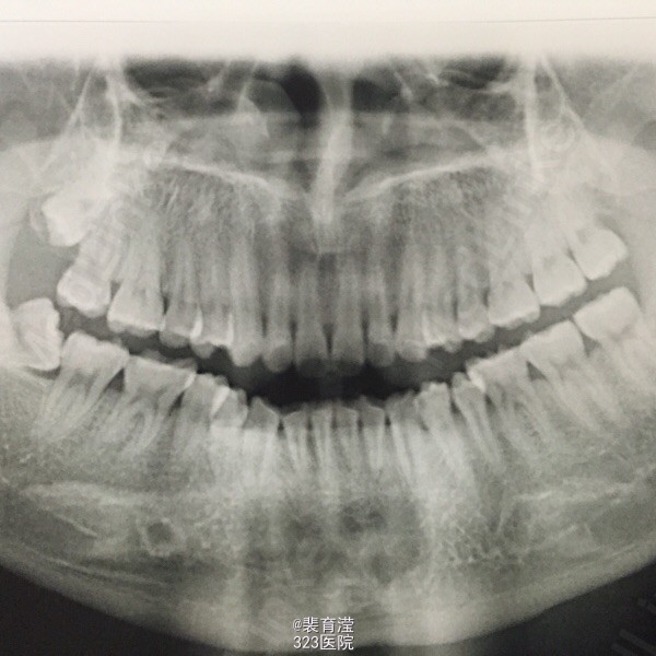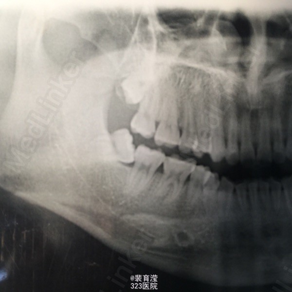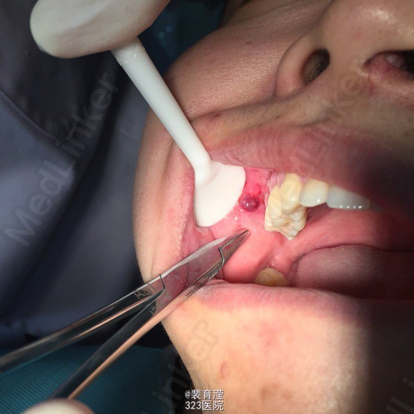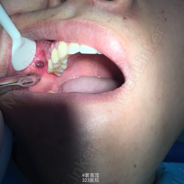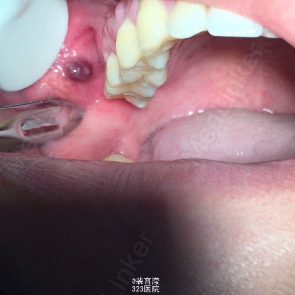 检查:右侧上颌第一磨牙,颊部前庭沟底,直径1.5mm 囊肿,探不适,波动感。 右下第三磨牙 近中阻生