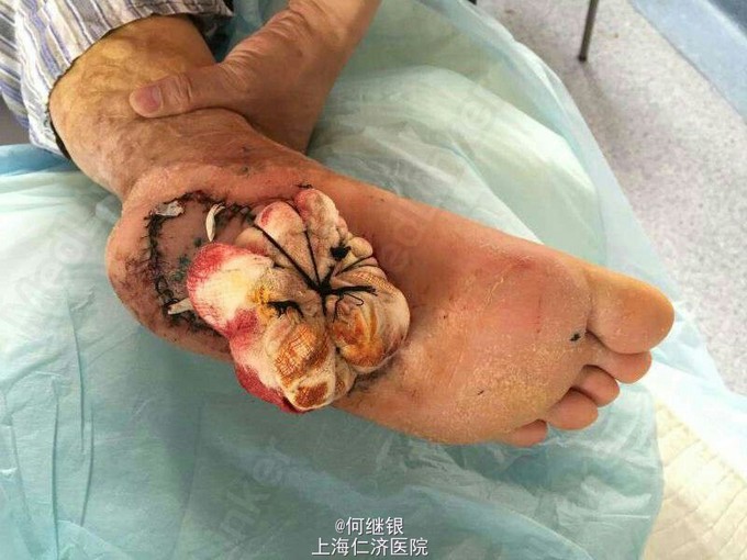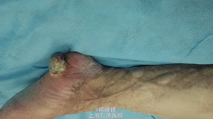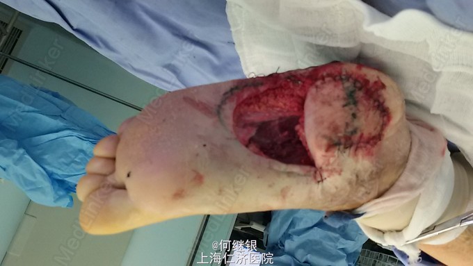 左足跟部鳞癌,感染。 频发室颤。 充分术前准备,扩大切除肿瘤。 皮瓣修复,植皮术。