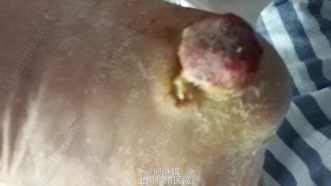 左足跟部间菜花样肿瘤,恶臭,有脓性分泌物。踝关节以上烧伤。Holter示频发室颤,24小时超过15000以上。外院活检结果为鳞癌。细菌培养为绿脓杆菌感染。