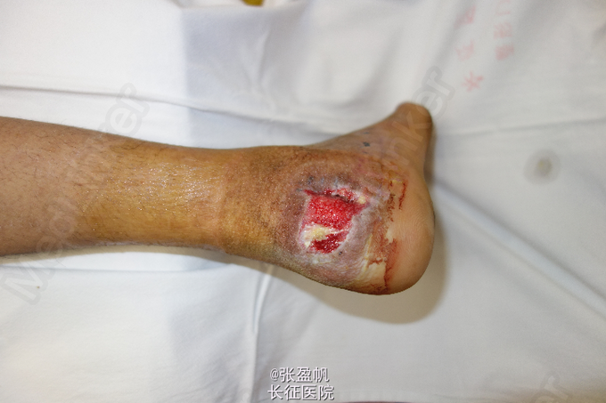 右足跟部见大小约3*3cm创面,可见明显钢板外露