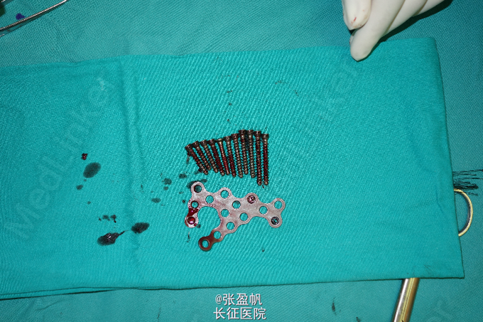 诊断:左足慢性溃疡:左足内固定术后 治疗:清创+VSD安置术两次后,肉芽生长良好,完全覆盖创面,三周后全麻下行内固定取出+腹部取皮+植皮术