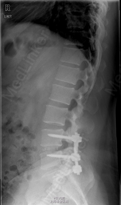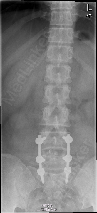 诊断: 1、腰椎椎间盘突出(L4-5,L5-S1) 2、腰椎椎管狭窄(L4-5,L5-S1) 处理: 经后路行L4-5,L5-S1椎管减压,椎间盘摘除,L4-5,L5-S1融合内固定术