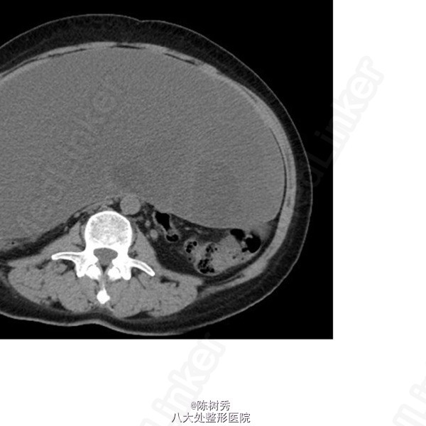 全身浅表淋巴结未及。腹部膨隆,未见胃肠型及蠕动波。腹软,全腹无压痛、反跳痛,全腹可及巨大肿物,质韧,边界清晰,活动度差,大小约30x27x12cm,无压痛及反跳痛。肝、脾肋下未及肿大,Murphy’s征(-),肝区叩痛(-),肾区无叩痛,肠鸣音可,移动性浊音(-)。直肠指诊(胸膝位):肛周皮肤无异常;进指7cm未及明显肿物,退指指套无血染。 辅 助 检 查 2015-05-07 腹盆增强CT+小肠重建 腹盆腔内巨大多房囊性肿块,请结合临床;盆腔少量积液;子宫节育器置入后改变。 2015-05-07 胸部CT平扫 双肺散在淡片、磨玻璃密度影;左肺门及纵隔多发小淋巴结,部分钙化;双侧胸膜局部增厚;心包稍厚。