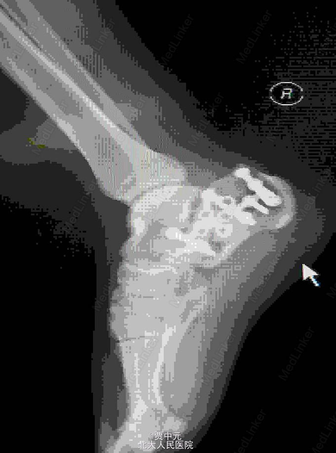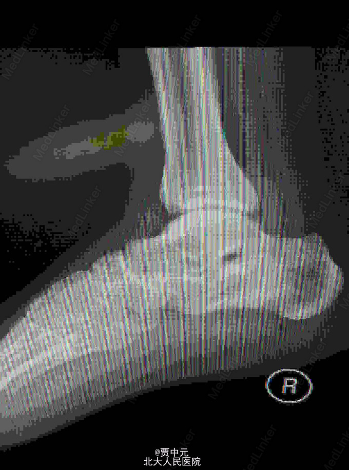 入院查体:右足跟部肿胀,局部皮下淤血,压痛,叩击痛,趾端血运可,足趾感觉及活动可,余肢体未见明显异常。 X线:右侧跟骨骨折(外院)