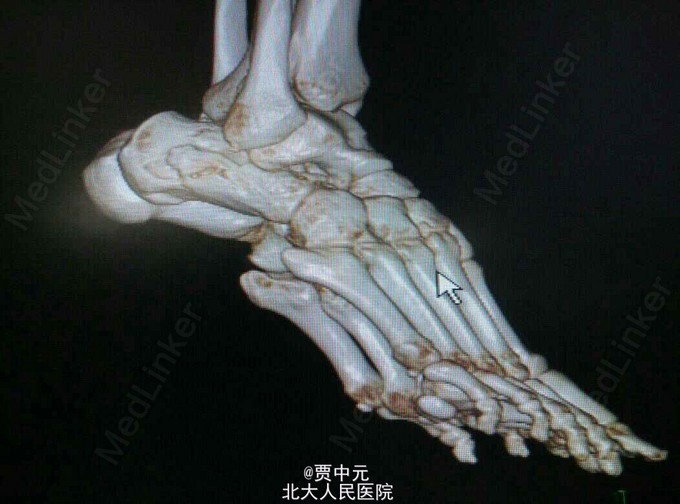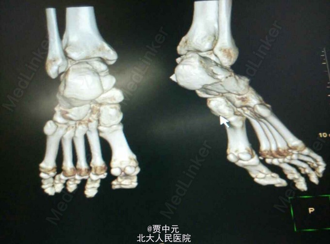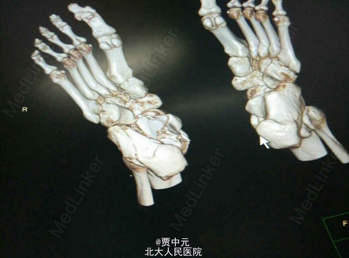 入院后考虑患者伤足局部软组织损伤重,皮肤条件欠佳,予以消肿,待皮纹征阳性后于今日在椎管内麻醉下行右跟骨骨折切开复位植骨内固定术。