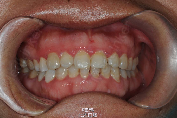 检查:口腔卫生较差,前牙牙龈乳头增生水肿明显,探质软,易出血,牙石(++),PD 4~5mm,BI 2~4,后牙 PLI 3 ,余牙PLI 1~2.18、28、38、48在,正位有咬合。