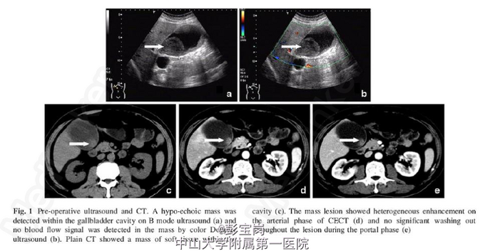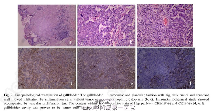出院诊断:混合性肝癌并胆囊转移。2月后复查: AFP 3.91ug/L;CA19-9 30.05U/mL 患者8个月后因“右上腹饱胀不适1月”入院,检查:AFP 5445.79 ug/L; CEA 13.64 ug/L;CA19-9 24.1 U/mL;CEUS检查:肝S6实性结节,符合HCC。CECT检查:肝S6 HCC。行穿刺活检证实为肝细胞癌;行经皮微波消融(MWA)治疗;后患者又反复行脾脏切除和右肝部分切除等手术治疗。 讨论:混合型肝癌发生肝外转移最常见于肝门部淋巴结、肺、骨和脾脏,很少有研究报道转移至胆囊(长在胆囊床肝脏不在此范围内)。而混合型肝癌可以像HCC一样发生门静脉侵犯,也可以像ICC发生淋巴结转移和胆管侵犯,而本例患者既无门静脉侵犯也无胆囊壁侵犯,该种病例既往未见报道。此外,初次病变表现为胆囊转移癌而无原发灶表现,直至术后8个月才发现,且二次病理提示为肝细胞癌,极为罕见。(本病例由我院黄漾博士整理并发表在(Dig Dis Sci (2013) 58:2733–2735),有兴趣可以下载阅读。