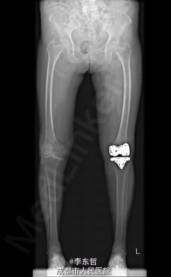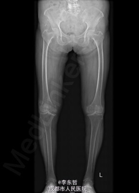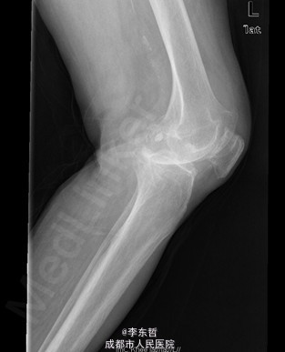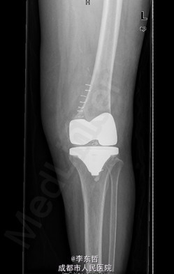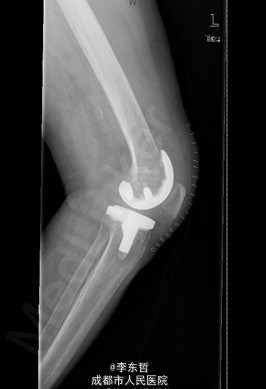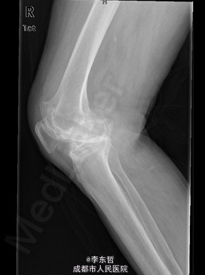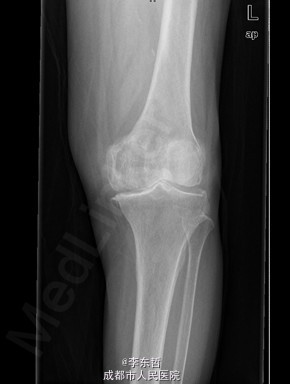 患者女,74岁,因“双膝疼痛20年,加重伴行走困难8年”入院。患者诉20年前开始出现双膝关节疼痛,负重行走、下楼时疼痛加重,休息后可缓解,尚可下蹲。自行购买止痛药口服,关节腔内注射玻璃酸钠、理疗等处理,疼痛时有缓解。但症状反复发作。8年前疼痛加重且行走困难,扶拐行走仅能坚持约10余米,上下楼梯艰难,下蹲不能,以左侧为重。遂来院就诊。