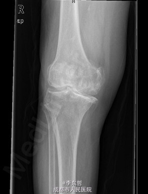 查体:跛行步态,双膝关节屈曲内翻畸形,双膝内侧间隙压痛,双膝髌股关节间隙压痛,左膝伸-20°,屈110°内翻10°。右膝伸-20°,屈110°内翻10°,双膝屈伸活动时髌骨下摩擦感(+)。 辅助检查:X片示双侧髌股关节内侧间室变窄,关节边缘骨赘增生,软骨下骨硬化。