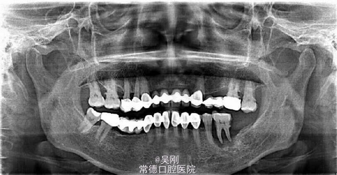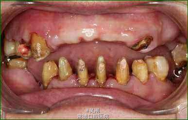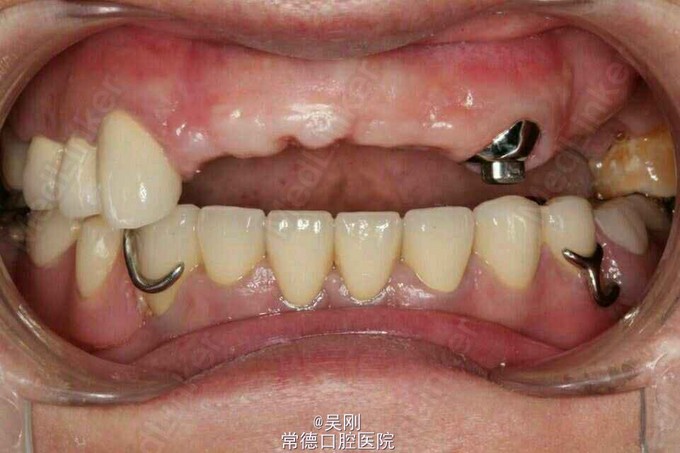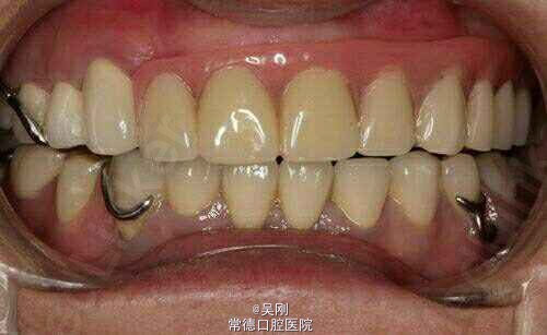 烤瓷桥边缘不密封,探出血。 左上烤瓷桥桥体折断。