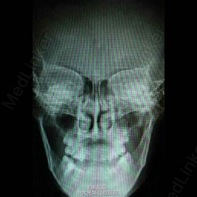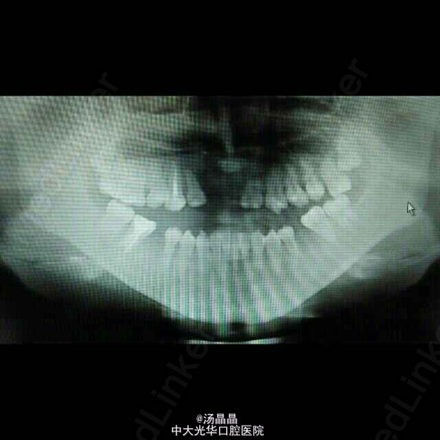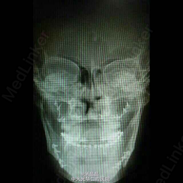 面下三分之一长面型,侧面严重凹面型,上颌后缩,下颌前突,双侧颞下颌动度一致,无压痛,未闻及弹响和杂音,全口牙齿见正畸托槽,16.11.21.25.36.46缺失,中线齐,全牙弓反合,反覆盖大于3cm