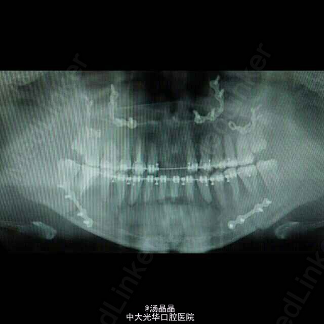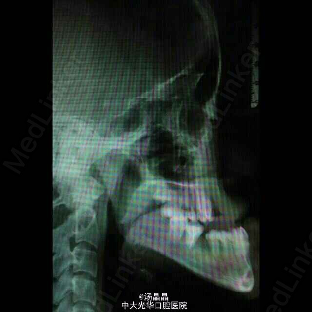 上颌前突,下颌后缩,治疗为:全麻下行上颌lefort I型截骨前徙术,BSSRO后退术,双侧下颌骨去骨皮质术,骨内坚固内固定术
