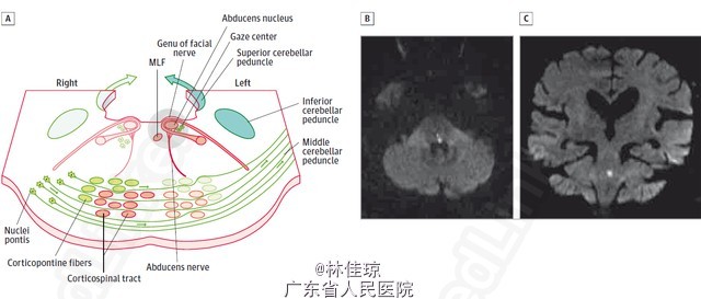 查体:左核间性眼肌麻痹,水平左侧凝视麻痹,左侧周围性面瘫。余未见异常。 头颅 MRI 显示脑桥可见一缺血性梗死灶。