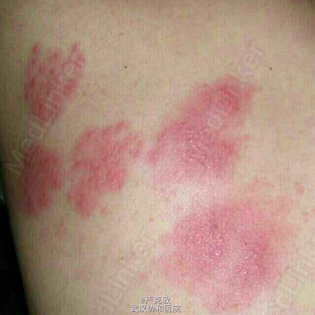 查体:左侧背部可见成簇水疱,见下图。 辅查:血常规、肝肾功能未见明显异常。