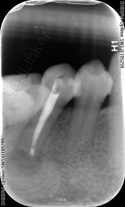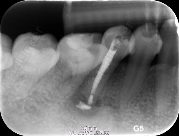 45根尖周炎,去腐,探及一根管,疏通,预备后,封Vitapex,GIC暂封