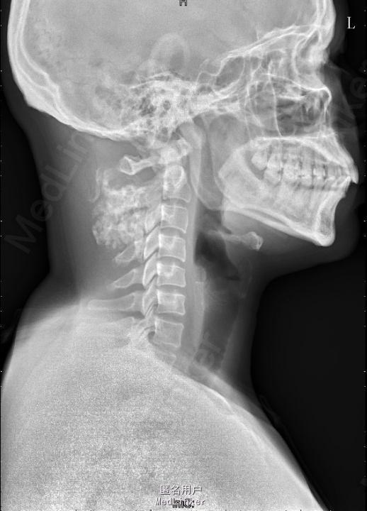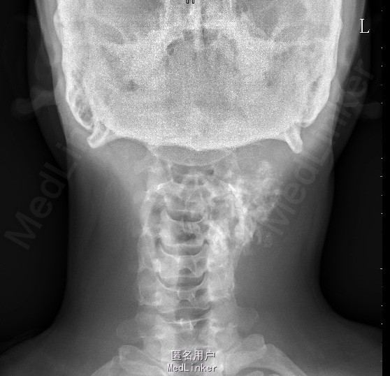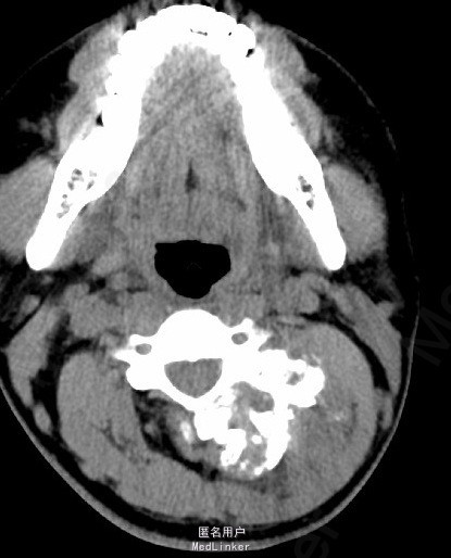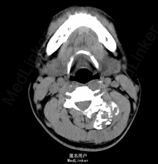 辅助检查:颈椎正侧位片示:颈部左后份软组织内见多发片状稍高密度影,约C2、3椎体平面,与椎体附件结构分界不清,颈部MRI检查示:左颈后肌间隙肿块,大小约4.9*3.9*5.4cm,考虑肿瘤病变可能性大,其他待排。入院后积极完善相关检查,查CT示:约颈3-4平面左侧软组织内见类圆形混杂密度肿块影,最大截面约4.6x4.5 cm,内见多发不规则钙化灶,增强扫描见不均匀强化,局部与邻近附件骨质关系密切,局部皮质稍显毛糙,上述考虑肿瘤性病变可能