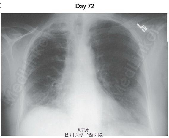 胸片发现不规则模糊影,主要分布在右半胸(入院后第3、5天胸片),经治疗模糊影明显消退(第72天胸片)。
