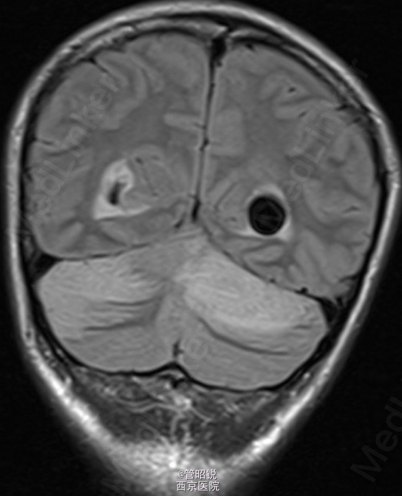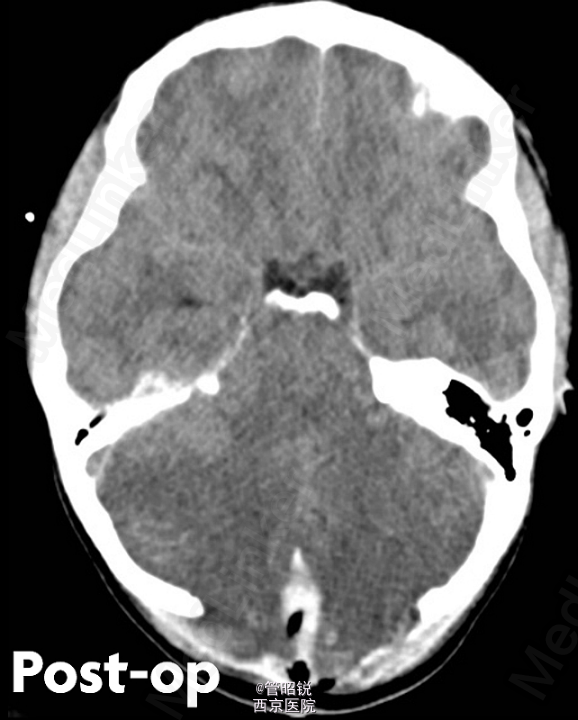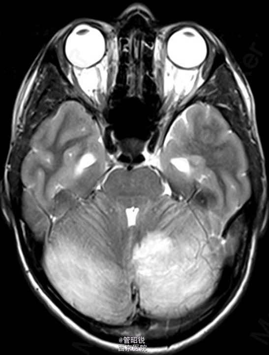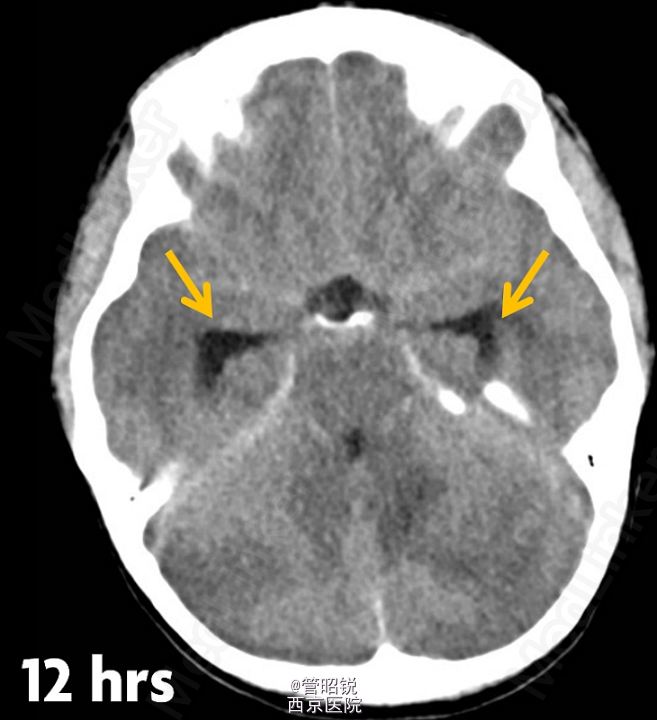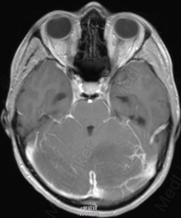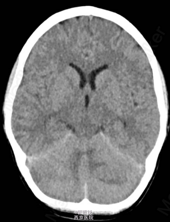 患者,男,29岁,头痛、颈痛2周 入院时CT正常,24小时后 T2WI (B) 和 T2W-FLAIR (C)显示高信号增强,脑水肿,沟回消失。CE-T1WI (D)显示脑膜线样增强。随后12小时的非增强CT显示小脑水肿压迫脑干,由于阻塞性脑积水使颞角膨大,需要紧急行颅后窝颅骨切除减压术。(影像资料比较典型。和大家分享下 AJNR-case of the week)