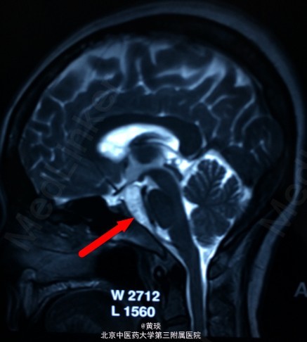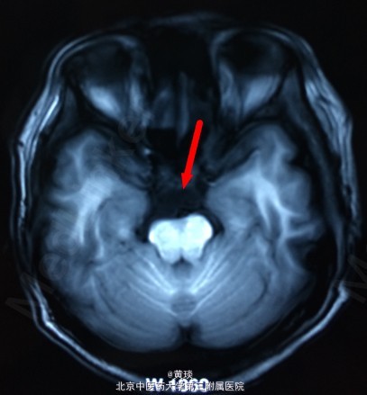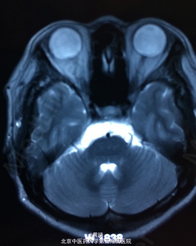 患者女,75岁,自诉压槽疼痛10年,未予重视,曾行封闭治疗无效,来我院,本来诊断为普通三叉神经痛,结果行MRI示:桥小脑角区占位,胆脂瘤,T1相高信号,T2相低信号,抑脂相高信号,压迫右侧三叉神经。
