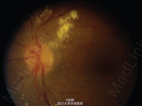 眼科检查:双眼最佳矫正视力均为1.0,裂隙灯检查发现双眼轻度核硬化性白内障,散瞳检查眼底,可见双眼玻璃体细胞密集,视盘充血、动脉衰减变细、局部动静脉鞘、硬性出血、视网膜变薄