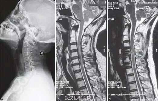 术后两小时发现,病人四肢瘫痪,上肢肌力2级,下肢肌力1级。 急诊颈椎MRI提示:1.颈椎 C4-5,5-6,6-7 椎间盘突出压迫脊髓,2.脊髓内有缺血、坏死(C4-C7),3.颈椎2、3分节不全(Klippel Feil syndrome,先天性颈椎融合畸形)。