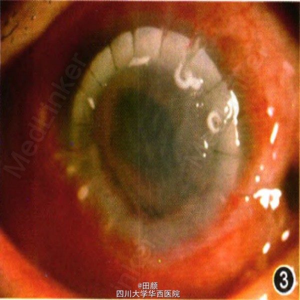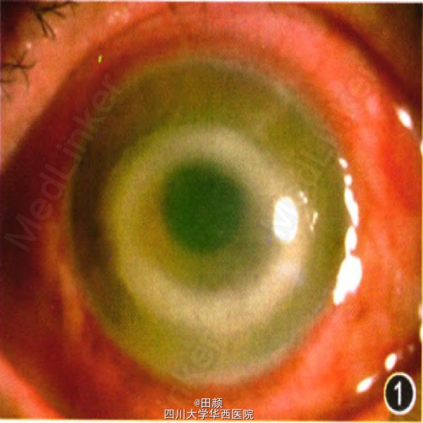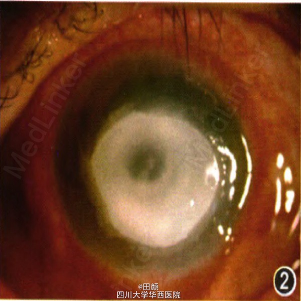 患者男,52岁,因左眼发红伴视力下降就诊,当地医院给予庆大霉素和0.1ml利多卡因结膜下注射,妥布霉素滴眼治疗
