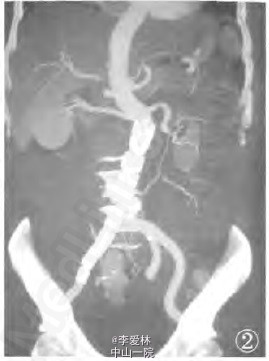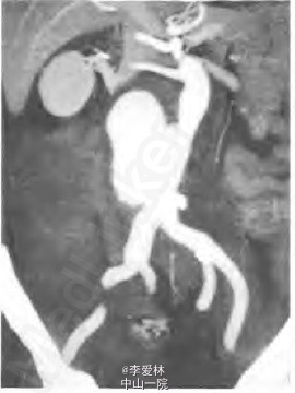 腹主动脉夹层动脉瘤破裂,予以急诊行腔内修复术(endovascular aortic repair。EVAR)。分别在腹主动脉和右髂总动脉植入一个直管型覆膜支架,将2个裂口封堵。